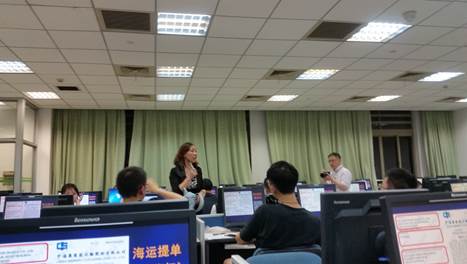 老师们先后观摩了上外贸许良靓老师依托于TMT平台的出口交易常规班的课程以及上外贸实验中心程洁主任的实验班课程,实地考察了外贸实践课程的开展模式以及教学软件的运行效果,并与程洁主任进行了深入的交流,了解上外贸在国际贸易实验教学方面的历史、现状以及软件的应用情况,特别听取了对方依托于ITS平台(Internet Trade Simulation)所进行的四方国际商贸模拟实践课程的介绍。商英的老师们还针对实践平台的具体操作流程、评估体系、学生反馈以及教学效果等方面的问题进行了认真的咨询。
