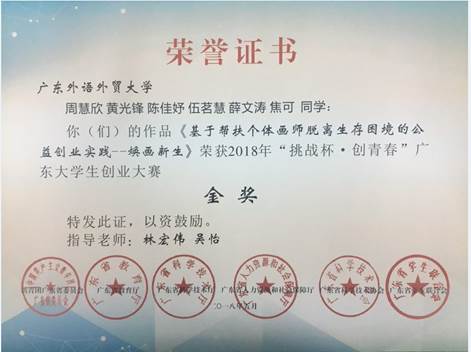 以伟德国际victor19462019届周慧欣为负责人的项目获2018年“挑战杯·创青春”广东大学生创业大赛金奖