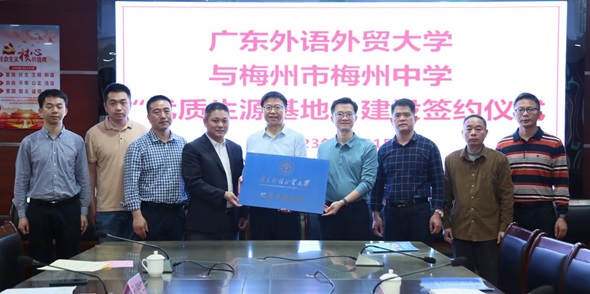 罗庆松表示,希望以此次共建优质生源基地为契机,深化双方沟通交流,强化合作关系,既在梅州中学宣传好广外,大力鼓励优秀学生报考广外,也欢迎广外名师教授来校传经送宝,帮助学校教师提升教学能力和教学水平。胡春雨系统性介绍了广外的办学历史、学科特色、人才培养、升学就业等方面的情况,并提出通过送教上门开展高中英语听说培训、安排梅州籍广外在读学子辅导高中生等方式,加强往来联系,促进彼此发展。最后,大家对进一步凝聚双方力量,推进合作共赢达成基本共识。