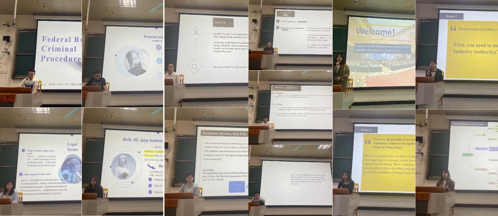 参赛的六个小组围绕《联邦刑事诉讼规则(Federal Rules of Criminal Procedure)》及《香港旅游条例(Travel Industry Ordinance)》,采用多种形式进行展示。有的组采用了真实场景再现方式予以展示,有的组采用新闻发布会形式展示,效果都出人意料的好。其中2001联邦刑诉组设置了新闻播报,并在现场进行扮演证人律师及法官,向观众生动形象地展现了美国刑事诉讼程序中的庭审环节;而2003旅游条例组及2001旅游条例组则采用了新闻发布会形式,由队员扮演记者或观众,向专家提问进行提问,专家通过解答向记者和观众解释了香港旅游条例中的相关规定。他们把法律条文落实到实际生活和法律英语学习中,切实地解决现实中面临的问题,令人印象深刻。所有参赛小组在展示中都表现出了沉稳、自信的精神风貌,以及相互支持、相互配合的团队精神。值得一提的是,各小组展示过程中英语口语流利、准确度很高,内容完整且组织逻辑清晰,组员之间衔接紧密、转换自然顺畅,PPT制作精美、动画图表结合。总之,整个比赛现场靓点频出,精彩不断,各参赛队的表现赢得了观众及评委的热烈掌声。
