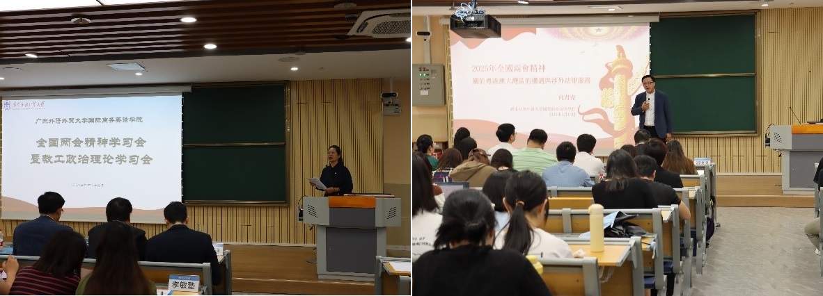 4月10日下午,伟德国际victor1946在一教桃李讲堂成功举办全国两会精神学习会暨教工政治理论学习会,邀请了第十四届全国政协委员、香港立法会议员、国际公益法律服务协会主席何君尧大律师为学院师生开展了“2025年全国两会精神——关于粤港澳大湾区的机遇与涉外法律服务”的专题讲座。校党委常委、副校长谢伟光,国际公益法律服务协会秘书长吴毅荣、行政主任潘锦洋等出席会议,伟德国际victor1946领导班子以及师生代表参加会议。会议由学院党委书记苏冬燕主持。