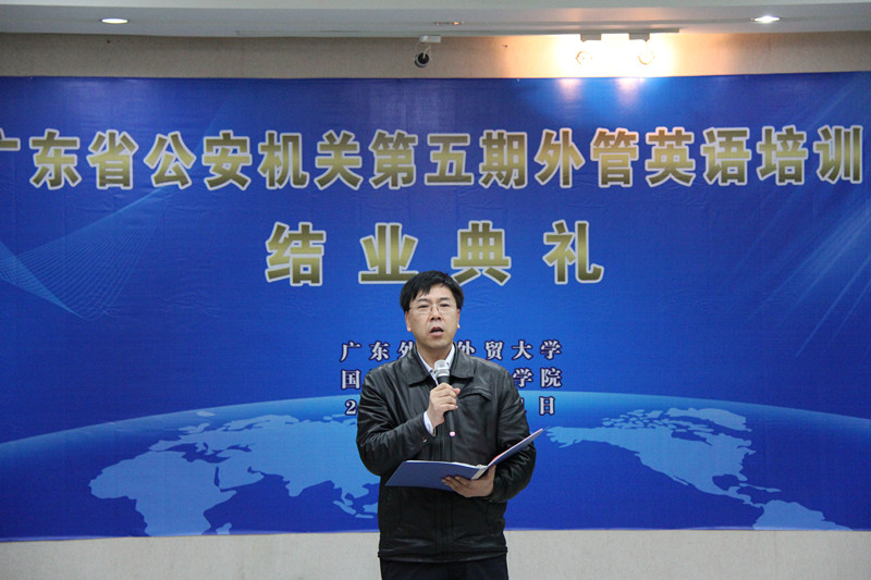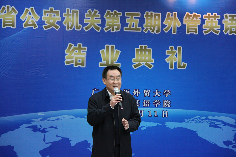 顾也力副校长首先发表讲话。他高度评价了本次外管英语培训班学员们的学习精神,并希望大家能将本次学习的成果用于工作上,更好地为人民服务。同时,他对省公安厅一贯以来予以广外的信任表示感谢,并希望在未来的日子里可以有更丰富、更深层的合作。