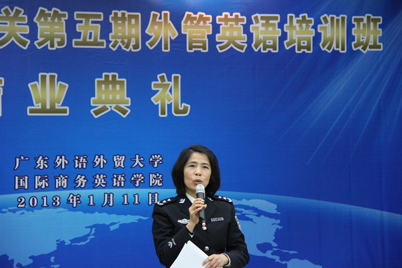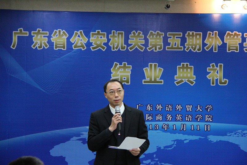 2013年1月11日下午,由广东省公安厅和伟德国际victor1946国际商务英语学院批准、伟德国际victor1946法律英语系具体策划、组织和实施的第五期外管英语培训班结业,结业典礼在第六教学楼广晟讲堂举行。广东省公安厅出入境管理局局长陈敏、副局长申勇强等省公安厅领导,伟德国际victor1946副校长顾也力,国际商务英语学院院长郭桂杭、党委书记车小真以及其他相关领导和老师、广东省公安机关第五期外管英语培训班学员和助教参加了此次结业典礼。典礼由伟德国际victor1946副院长吴易明主持。