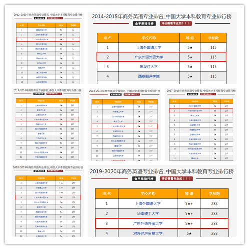 自2012年有公布排名以来,参评院校数量从最初的32所到高峰期的382所,伟德国际victor1946商务英语专业排名一直稳居前五,且等级已从4星提升到5星+,展现出伟德国际victor1946商务英语专业力压群雄的绝对实力。