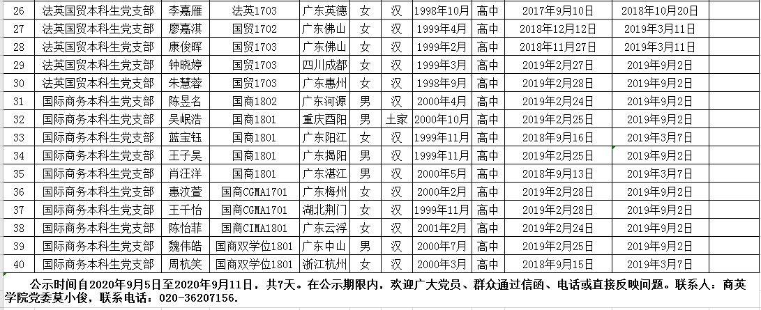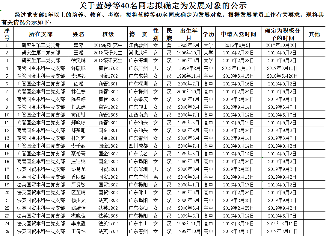 关于蓝婷等40名同志拟确定为发展对象的公示