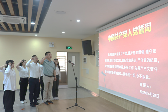 与会同志观看了学院主题教育工作纪实短片。学院党委委员、副院长汪谓超带领今年新发展的95位党员同志和全体教工党员面向党旗进行宣誓。在鲜红的党旗前,全体党员紧握右拳,铿锵有力、掷地有声的誓词再一次点燃了大家爱党、忠诚、担当、奉献的激情,坚定了广大党员助力学院高质量发展,勇担责任敢立新功的决心。